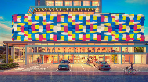 O design também expressa a identidade dinâmica e conectada do empreendimento. Já na fachada, esses conceitos são evidenciados em diversos detalhes, como no imponente painel em mosaico que abraça o prédio.